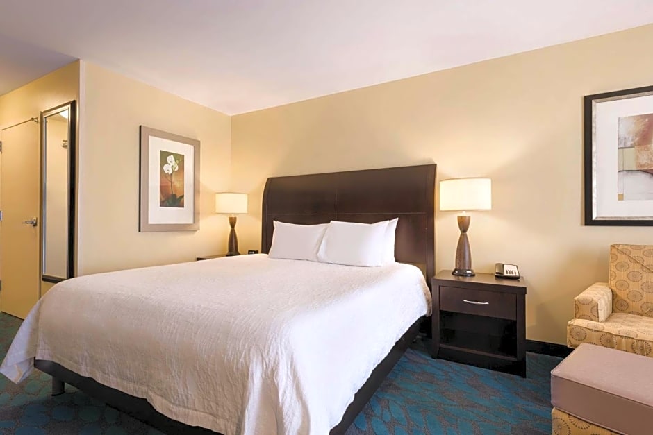 This mobility and hearing accessible standard room features one king-sized bed, and an accessible tub. The room also has a visual alarm, and notification devices for the doorbell or door knock and incoming telephone calls. Grab bar in tub with attached accessible seating, lowered vanity in bathroom, and lowered closet shelf. And the pursuit of the perfect night's stay continues with an evolution of innovative new amenities including the bed, chair, and television. The ergonomic chair is good for your back and better for work. Enjoy your favorite television show on our 32-inch HDTV. There's also a microwave, refrigerator and Keurig coffeemaker to help you feel at home. And for conducting business, our rooms ensure your productivity thanks to the spacious work desk, two telephones with dataport and voicemail and complimentary WiFi. Any corresponding photo may not reflect the specific accessible room type or room feature.