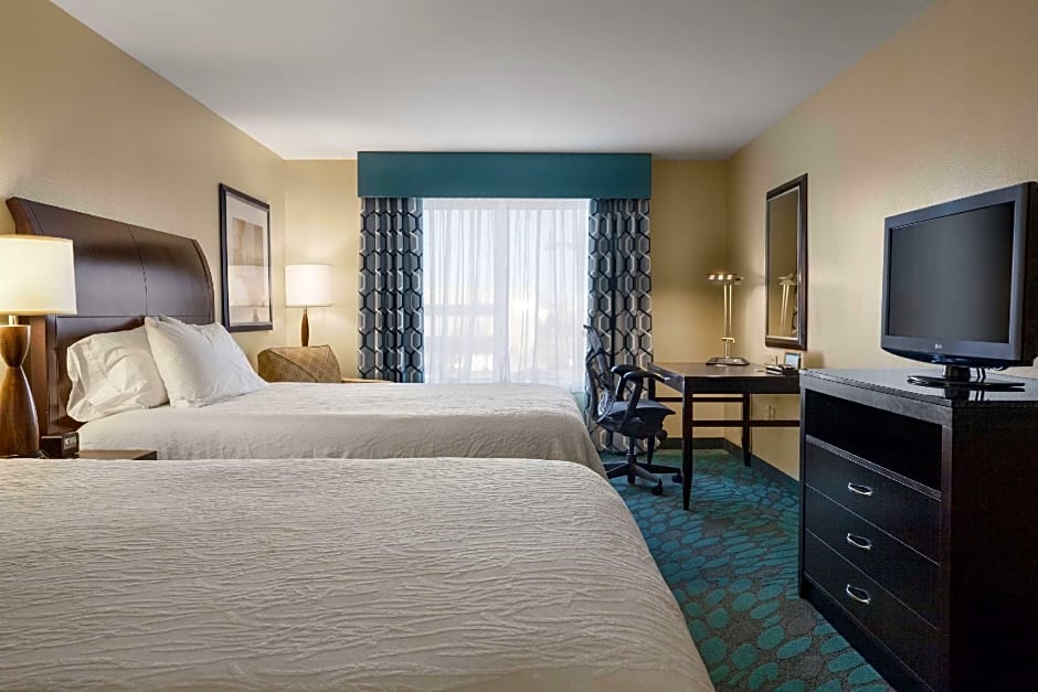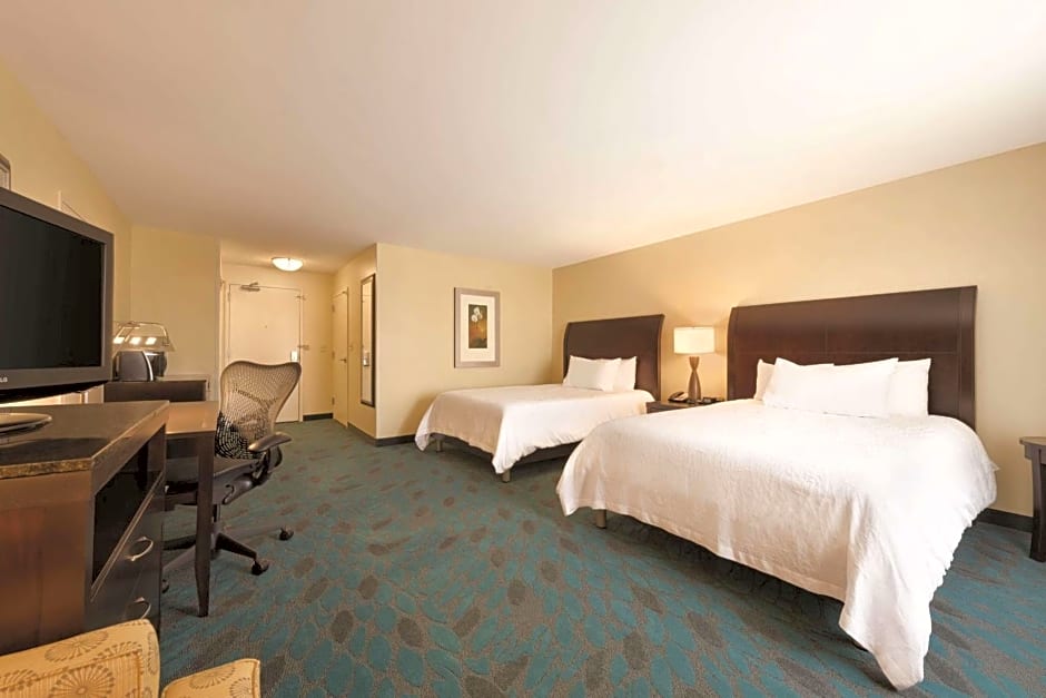 This mobility and hearing accessible standard room features two queen-sized beds, and a roll-in shower. The room also has a visual alarm, and notification devices for the doorbell or door knock and incoming telephone calls. Roll-in shower with attached accessible seating, lowered vanity in bathroom, and lowered closet shelf. And the pursuit of the perfect night's stay continues with new amenities including the bed, chair, and TV. The ergonomic chair is good for your back and better for work. Enjoy your favorite television show on our 32-inch HDTV. There's also a microwave, refrigerator and Keurig coffeemaker to help you feel at home. And for conducting business, our rooms ensure your productivity thanks to the spacious work desk, two telephones with dataport and voicemail and complimentary WiFi. Any corresponding photo may not reflect the specific accessible room type or room feature.